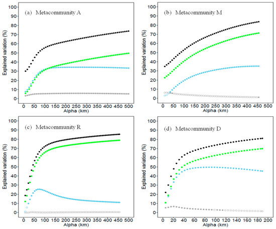 Changes in total explained variation (black point) and unique predictor explained variation as a function of α values in (a) metacommunity A (localities in the whole study area), (b) metacommunity M (localities in the mountain landscape), (c) metacommunity R (localities in the riparian landscape) and (d) metacommunity D (localities in the desert landscape). Due to the correlation with connectivity predictor (green points), the unique contributions of space (blue points) and environment (grey points) are also affected by α values. Solid points indicate the contribution is significant (p < 0.05, Monte Carlo permutest) and circles indicate contributions that are not significant.