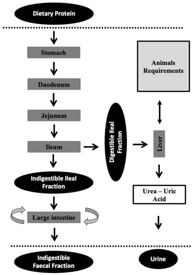 Figure 1 shows how only a portion of total ingested crude protein (CP) is digested and converted into amino acids that can be absorbed in the small intestine. The amino acids that are absorbed until ileum correspond to the ileal digestible CP. The rest (ileal indigestible CP) undergo processes into the large intestine where they can be used or modified by microbial action and finally eliminated in faeces (faecal indigestible CP). It is therefore reasonable to believe that ileal amino acid digestibility (and especially true ileal digestibility, which takes into account the endogenous losses) allows us to know the quantity of amino acids that are available for the animal [28], giving valuable information on both the animal’s requirements and nutritional balance of the diet.