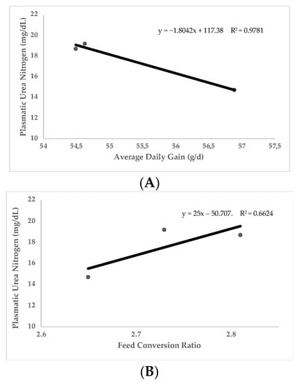Relationship of plasmatic urea nitrogen (PUN) with average daily gain (A) and with feed conversion ratio (B). Data obtained from four published studies in growing rabbits [2,60,87,89].