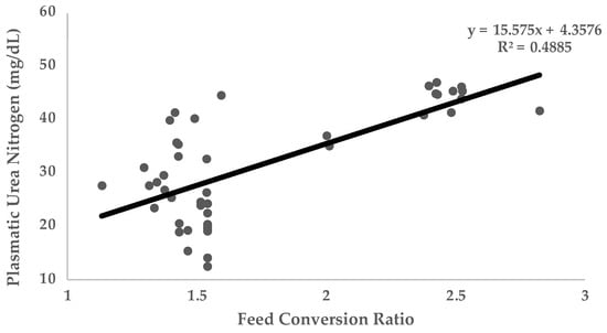 Relationship of plasmatic urea nitrogen (PUN) with feed conversion ratio. Data obtained from four published studies in growing pigs [65,66,73,75,76,78].