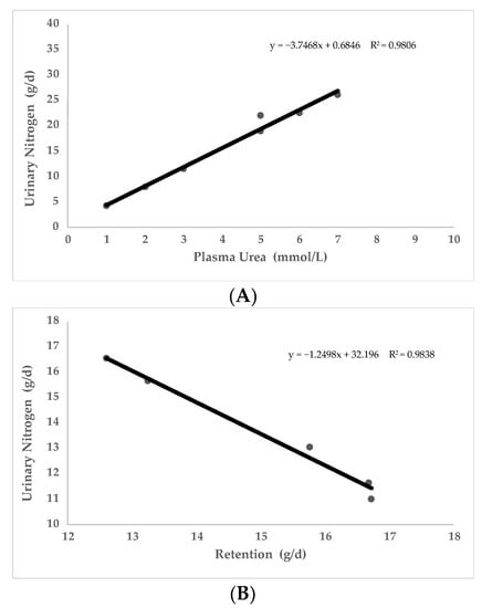 Relationship of plasma urea nitrogen (PUN) with urinary nitrogen excreted (A) and relationship of urinary nitrogen excreted with Nitrogen retained (B). Data obtained from two published studies in sows and growing pigs [71,86].