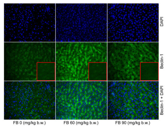Effect of maternal FB intoxication on the level of autophagy (detected by Beclin-1 level) in the livers of offspring upon weaning, at 28 days of age. The red square inserts represent primary antibody controls. Magnification ×200.