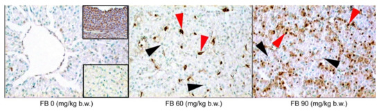 Effect of maternal FB intoxication apoptosis in liver (detected by the TUNEL reaction) of female offspring upon weaning, at 28 days of age. The black arrowheads indicate normal hepatocyte nuclei, and the red arrowheads indicate apoptotic cells. Upper insert–positive control of the TUNEL reaction–apoptotic granulosa cells in a rat preovulatory follicle. Lower insert–negative control of the TUNEL reaction–liver. Magnification ×200. Additional photos are included in the Supplementary Materials in Figure S1.