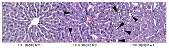 Effect of maternal FB intoxication on the liver structure of male offspring upon weaning, at 28 days of age. The black arrowheads indicate ballooning and the white arrowheads indicate degenerative chromatin condensation. Magnification ×200.