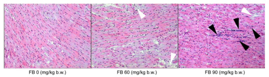 Effect of maternal FB intoxication on the heart structure of female offspring upon weaning, at 28 days of age. The lack arrowheads indicate inflammatory cell infiltration in the myocardium and the white arrowheads indicate tissue weakness and probable ischemic injury. Magnification ×200.