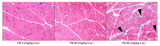 We also observed changes in the serum concentration of the total protein, which cannot be considered without taking into account the blood basal morphology, where the erythrogram showed an increase in the number of the RBC and other parameters that are related to the RBC. Given all of these changes, it is reasonable to assume that the offspring of the rats were most likely dehydrated after the FB exposure, or they suffered from renal impairment by FB (although the Na concentration and the renal histology were not assessed) or respiratory failure with asphyxia. A decrease in the lungs weight was observed following the FB exposure in the males. Future studies should perform a histological evaluation of the lungs tissue, especially since FB triggers pulmonary edema [44]. Moreover, the current study showed changes in the striated muscles, such as the heart and skeletal muscle. The CK (which is indicative of striated muscle injury) and the LDH (which is indicative of tissue damage, including the striated muscle and the liver) were increased in our weaned rats. This could indicate that ATP is more rapidly consumed by the muscles, and muscle failure (or acute kidney injury), including heart failure, occurred. Moreover, the current study also showed a decrease in the WBC in the males, which is directly indicative of intoxication, and was most likely caused by the infiltration of the muscle by leucocytes (Figure 4 and Figure 5). It can be assumed that these changes can lead to the weakening of the heart and skeletal muscles, and because the birth process is dependent on the functioning of the intercostal muscles, it can result in respiratory failure and an increase in some of the red blood cell parameters. The results of the current study are supported by an earlier study, in which the basal blood morphology was performed and an increase in both the HCT and the HCB was observed in broilers that were fed feed that was naturally contaminated with FB [45].