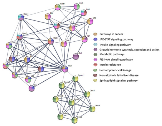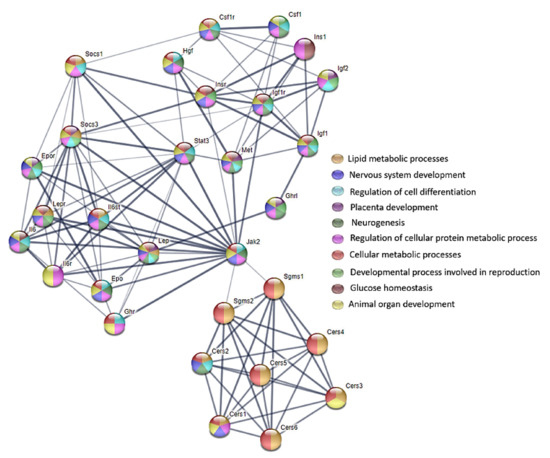 STRING protein–protein interaction diagram in various biological processes involving lipid-biosynthesis-related proteins inhibited by FB (ceramide synthase and serine/threonine phosphatase) in a rat model; https://string-db.org/, accessed on 17 June 2022. The thickest edge indicates the highest confidence in protein–protein association. The network contains 30 nodes. Gene ontology pathway analysis revealed that the presented proteins are involved in many biological pathways; https://string-db.org/, accessed on 24 July 2022.
