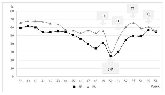 Egg-laying rate (%) of Bianca di Saluzzo (BS) and Bionda Piemontese (BP) laying hens from 38 to 56 weeks of age. T0: 1-week pre-Stressful Farming Practice (SPF); T1: 1-week post-SFP; T2: 3-week post-SFP; T3: 5-week post-SFP.