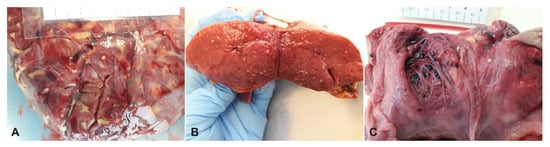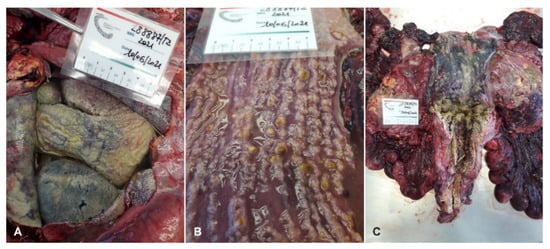 The sea turtle had a curved carapace length (CCL) of 77.5 cm and a body weight of 60.17 kg. The turtle was in poor body condition: it had sunken eyes and thin shoulders; the neck, axillary, and inguinal regions and the central plastron area were depressed. A significant bilateral purulent ocular discharge was observed. During necropsy, the turtle was identified as an adult female. The most significant post-mortem gross lesions included pericardial effusion (Figure 1A), yellow lamellate material and yellowish-grey warty buttons on the mucous membrane of the intestine (Figure 1B), and enlarged ovarian follicles and serosal fibrinous plaques of the urinary bladder (Figure 1C). Moreover, yellow foci of necrosis in the kidneys (Figure 2A), liver, and spleen (Figure 2B), as well as in the cardiac tissue (Figure 2C) with parenchymal flaccidity were observed. The lungs were severely compromised with bilaterally diffuse granulomatous lesions in the parenchyma.