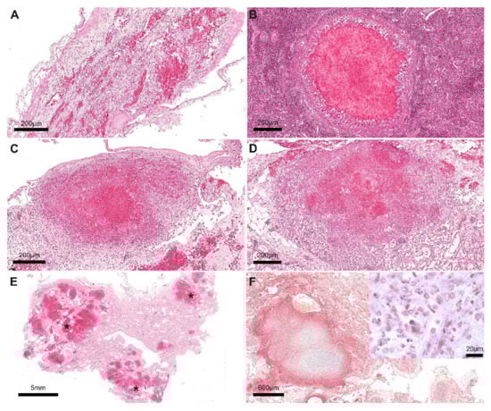 Granulomatous lesions with central necrosis were detected in the brain meninges (A), spleen (B), liver (C), and kidney (D). Multifocal granulomatous foci of bronchopneumonia were seen in the lung (black asterisks) (E). In the lung (F), numerous rod-shaped Gram-positive bacteria were detected between the inflammatory infiltrate (figure inset). Scale bar = 200 µm (A–D), 5 mm (E), 600 µm (F), 20 µm (F, inset). Hematoxylin and eosin stain: A–E. Gram stain: F and figure inset.