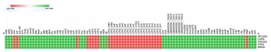 Core genome MLST (cgMLST) of Lm was calculated according to the Institute Pasteur’s scheme of 1748 target loci using the chewBBACA allele-calling algorithm [24]. Genomes with at least 1660 called loci (95% of the full scheme) were considered. Genome assemblies were screened for the presence/absence of virulence, disinfectants/metal resistance, and antimicrobial resistance genes using different functions available on the BIGSdb-Lm platform (http://bigsdb.pasteur.fr/listeria (accessed on 3 June 2022). All strains isolated in different organs shared the same pattern; hence, 64 out of 93 virulence genes were present. Among them, genes primarily involved in virulence were found: Listeria Pathogenicity Island (LIPI)-1 (actA, prfA, hlyA, mpl, plcA, and plcB), Internalins (inlA, inlB, inlC, and inlJ) and LIPI-4 (LM9005581-7009, LM9005581-7010, LM9005581-7011, LM9005581-7012, LM9005581-7013, LM9005581-70014), IntA, inlF, and vip. A heatmap of virulence genes’ presence is reported in Figure 4. Out of 117 genes investigated, the only Listeria Genomic Island (LGI) found was LGI-2_LMOSA2310. All genes belonging to the SigB factor were present (lmo0889, lmo0890, lmo0891, lmo0892, lmo0893, lmo0894 lmo0895, lmo0896), while the only Stress Survival Islet (SSI) genes identified were lmo1799, lmo1800, and SSI1_lmo0447. Finally, the antibiotic resistance genes detected from the sequenced genome were fosX, lmo0919, mprF, norB, and sul.