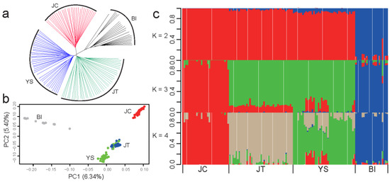 We then examined the genetic relationship between JC goats and other black breeds by using our previously generated WGS data for 41 JT goats [16,17] (NCBI accession numbers: PRJNA548681 and PRJNA734084). We also downloaded WGS data for 40 YS goats [5] (NCBI accession number: PRJNA611688) and 21 Bezoar ibexes [18] (NCBI accession number: PRJEB3136).
