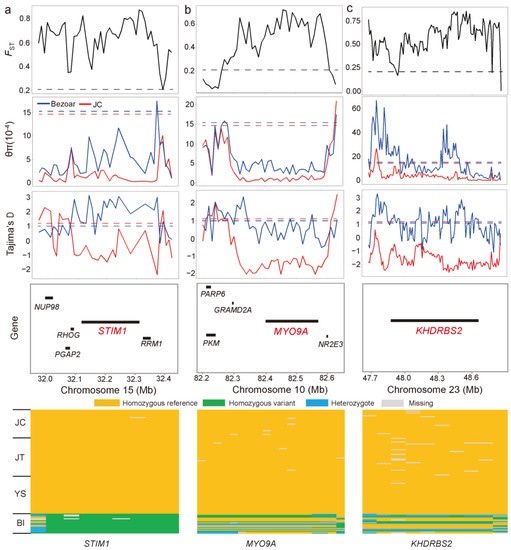 To accurately search for positive selection signatures in JC goats, we applied iHH12 scores and FST (JC vs. Bezoars) with a threshold of top 0.5% of windows (i.e., iHH12 > 7.10 and FST > 0.68) (Figure 4c and Supplementary Materials Figure S5), in addition to ROH islands. Accordingly, we identified a total of 61 positively selected genes (PSGs, Supplementary Materials Table S8), which were significantly enriched in 384 GO biological processes (p < 0.05). Many GO terms were immune related, such as the regulation of alpha-beta T cell proliferation (2 PSGs, CD274 and JAK2), alpha-beta T cell activation (3 PSGs, MTOR, CD274, and JAK2), and immune system development (6 PSGs, e.g., MTOR, CD274, and KIT) (Supplementary Materials Table S9). According to their biological functions and the distributions of SNPs within the corresponding regions across the sampled goat populations, several genes may be relevant for important traits in JC goats. For example, FST was very high (average windowed FST = 0.74) in the genomic region encompassing STIM1 at 32,118,087–32,314,109 bp on Chromosome 15, which was supported by lower values of π (average π = 1.40 × 10−4) and Tajima’s D (average value = −0.84) (Figure 5a). There were 333 biallelic SNPs within the STIM1 gene, among which 184 SNPs, including one missense substitution (c.5G > C, p.Arg2Pro; chr15:32,230,281) in exon 1, were fixed for the reference allele in JC goats. Strikingly, eight SNPs were fixed for the reference alleles in all 111 domestic goat samples, while the mutant alleles at these SNPs reached fixation in Bezoars (Figure 5a and Supplementary Materials Table S10). As shown in Figure 5b, the MYO9A gene (Chromosome 10: 82,392,953–82,577,244 bp) was under strong selection (average windowed FST = 0.71), which also showed lower π and Tajima’s D values. Overall, 18 SNPs in MYO9A are fixed for the reference alleles in the three black breeds (Figure 5b and Supplementary Materials Table S10). In addition, KHDRBS2 (Chromosome 23: 47,871,981–48,673,939 bp) fell in a clear selective sweep that contained some windows with extremely low Tajima’s D values (average value = −1.62) (Figure 5c). The reference alleles at 10 SNP sites within KHDRBS2 reach fixation in all three black breeds (Figure 5c and Supplementary Materials Table S10).