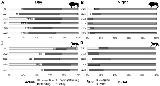 As already mentioned, the behavioural and physiological processes of animals are constantly influenced by endogenous and exogenous stimuli. Besides feeding, another stimulus is light [30,39]. As one of the strongest zeitgebers, light has a major impact on animal activity [1,27,70]. Results of our study confirm such an effect of light on behaviour by observing drastic differences in activity during the day and the night as well as during dusk. From dusk on lions and cheetahs were mainly resting and sleeping for the rest of the night. In the early morning hours, both species became more active again from two hours before sunset on. Besides light, the season has been shown to influence activity and resting behaviour of carnivores [34,99,100]. For instance, at high temperatures, main activity in cheetahs shifted from day to night [34]. Lions also adapted their activity and resting behaviour to the temperature by being more active on cooler days [100]. Compared to summer, in autumn months, lions were observed to be active later in the morning and earlier in the evening [86]. This leads to a natural variation in the day–night rhythm from summer to winter. Due to these potential seasonal influences and to ensure comparability between zoos, the study design was restricted to recordings during one season (winter).