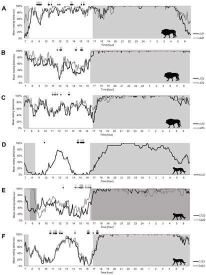 Time course of resting behaviour over 24 h: Resting behaviour of lions (A–C) and cheetahs (D–F) over a study period of 14 days (7a.m.–7p.m.) and nights (7p.m.–7a.m.). For identification purposes, individuals were categorised as follows: species/individual/zoo. Arrows mark feeding events throughout the observation period. Grey areas show dark periods. In zoo3 (E) dark periods vary between individuals due to different observation periods.