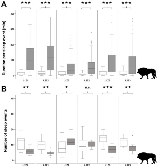 Diurnal (7 a.m.–7 p.m.) and nocturnal (7 p.m.–7 a.m.) sleep patterns of lions. (A) Duration per sleep event and (B) Number of sleep events per day (white boxes) and per night (grey boxes); n.s. > 0.05; ★ p < 0.05; ★★ p < 0.01; ★★★ p < 0.001) over the total observation period.