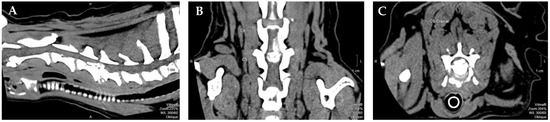 All dogs included in this study had IVDD—Hansen type I with cervical neuro-location (n = 114), specifically with C1–C5 location. Dogs were referred by the neurology department of another hospital after IVDD diagnosis by X-ray and CT or myelo-CT (Figure 1), and performed single-ventral slot surgery. Dogs presented tetraplegic and clinical signs manifested for 1 to 5 days until surgery. At admission, all remained tetraplegic and were classified in grade 1, according to the modified Frankel scale (MFS), and grade 1, according to the open field score (OFS), therefore with deep pain perception (DPP+).