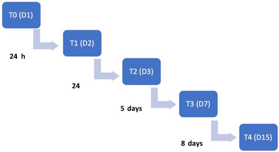 Time points of evaluations included the admission day (T0), 24 h (T1), 48 h (T2), 7 days (T3) and 15 days after admission (T4). The flow diagram describing the evolution according to the time points is illustrated in Figure 3.
