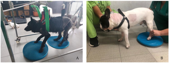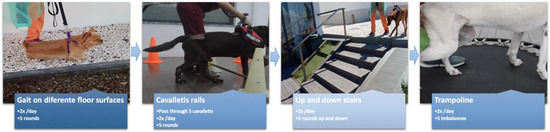 Participants performed the same protocol in a calm environment with music, starting with postural standing (1 min) with the help of a passive standing device (Figure 4A), followed by 30 bicycle movements in a central pad stimulation with a rough surface (Figure 4B), 4–6 times per day and 3–5 days per week. Two rehabilitation nurses and two veterinarians were needed to perform these exercises, assuring the rhythm and coordination between the forelimbs and hindlimbs, similar to locomotion. All these exercises were completed while listening to music, and their progression is described in Figure 5.