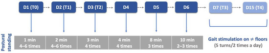 Additionally, the kinematic and kinesiotherapy exercises included cavalleti rails, trampoline, ramps and different floor surfaces that started at day 7 (T3 time point), following the order described in Figure 9.