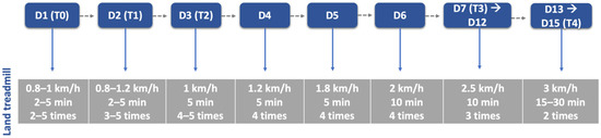 Land treadmill protocol throughout this study. D: day; T: time point; T0: admission day; T1: day 2; T2: day 3; T3: day 7; T4: day 15.