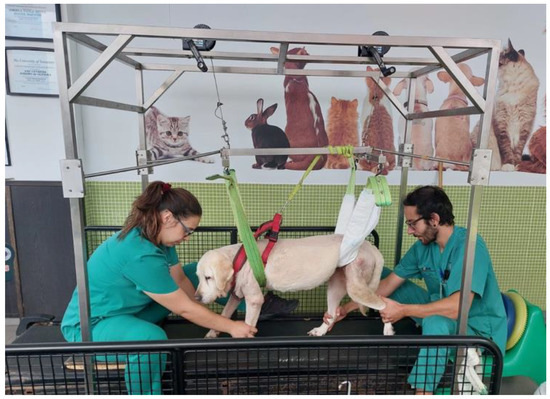 After a 30 min rest, all dogs executed the locomotor training on the land treadmill with slope (Fit Fur Life, Haslemere, UK), with the same terms regarding team members and coordination/rhythm of the movement. Training started at 0.8–1 km/h without slope and weight support by two straps, progressively increasing (Figure 6) Dogs with more than 10 kg resorted to a weight-support device (Figure 7). This was performed 4–6 times per day, 3–5 days per week, and in older dogs (≥6 kg) with monitoring by electrocardiogram (Mindray iMEC8 Vet, Shenzhen, China) and for vital parameters (e.g., heart rate, respiratory rate, perfusion parameters and rectal temperature). Dogs were excluded from this study if they had extra-systoles or other arrhythmias, and any deviations from the vital parameters were recorded daily.