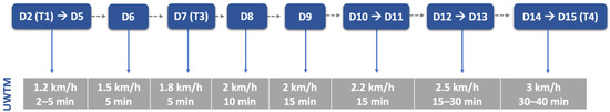 The aquatic exercises were always performed during morning time and introduced carefully after 48 h of admission, especially in dogs with spinal shock signs and decreased muscle tone. To avoid suture contamination by water, technicians´ hands had to be dry and water line near the proximal epiphysis of the tibia. Water temperature was near 24–26 °C and treadmill velocity started at 1.2 km/h, from 2 to 5 min until 40 min, with progression described in Figure 8.