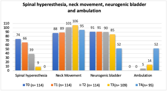 Total population frequency analysis of spinal hyperesthesia, neck movement, neurogenic bladder and ambulation evolution throughout the study time points. T0: admission day; T1: day 2; T2: day 3; T3: day 7; and T4: day 15; x-axis: neurorehabilitation check list parameters; y-axis: frequency number.