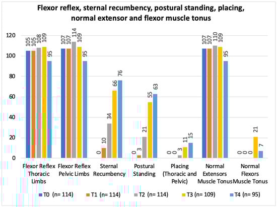 Total population frequency analysis of flexor reflex, sternal recumbency, postural standing, placing, normal extensor and flexor muscle tonus evolution along the study time points. T0: admission day; T1: day 2; T2: day 3; T3: day 7; and T4: day 15; x-axis: neurorehabilitation check list parameters; y-axis: frequency number.