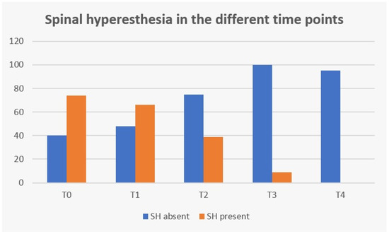 Frequency analysis of spinal hyperesthesia (SH) during study time points. T0: admission day; T1: day 2; T2: day 3; T3: day 7; and T4: day 15; x-axis: time points of this study; y-axis: frequency number.