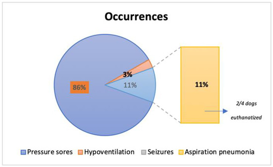 Occurrences were present in 31.58% (36/114) of the total population (Figure 13), with 31 dogs presenting pressure sores throughout the study time, 1 dog with hypoventilation and 4 dogs with aspiration pneumonia (2 of them euthanatized at T4 for further complications). No seizures were reported during the study time. Additionally, pressure sores that were present in 27.25% (31/114), revealed a solid significance between their presence and the ambulatory status achieved (X2(1, n = 114) = 70.304, p < 0.001).