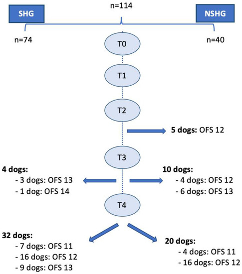 Ambulatory status was achieved in 62.3% (71/114) of total population within the first 15 days. Five dogs were ambulatory and had medical discharge at time point T2, followed by 14 dogs and 52 dogs at the time points T3 and T4, correspondingly (Figure 14). Considering the ambulatory dogs, 32.4% (23/71) showed the ability to perform ≥ than 10 steps in different floors (OFS 13 or 14), by the time of medical discharge. Of the total population, 43 dogs remained non-ambulatory until T4 (day 15).