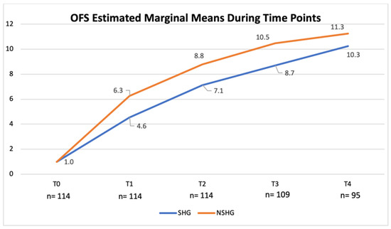OFS scores obtained at the time of medical discharge were compared in both the SHG and the NSHG using non-parametric the Kruskal–Wallis test and the non-parametric Mann–Whitney test, which revealed evident difference in the distribution of OFS scores between groups (p < 0.001). Additionally, according to the univariate analysis of variance, a significant difference between both groups in each time point was observed (p < 0.001; adjusted R2 = 0.809). OFS scores for the SHG and the NSHG were registered and estimated marginal means evolution chart is shown in Figure 15.