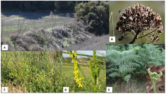 Some examples of plants associated with haemorraghic disorders. (A) Giant fennel (Ferulla communis) on an embankment. (B) General aspect of fruits of giant fennel. (C) Sweet clover (Melilotus officinalis) grown on the edge of a wheat field. (D) Flower of M. officinalis. (E) General aspect and fronds of bracken fern (Pteridium aquilinum). The small picture shows a “fiddlehead” sprouting.