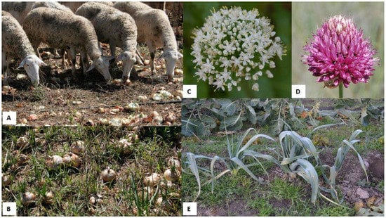 (A) A sheep herd grazing on an onion (Allium cepa) field. (B) Onion (A. cepa) field ready to harvest. (C) Characteristic umbel of white flowers of an onion (A. cepa). (D) Umbel of pink flowers of a round-headed leek (A. sphaerocephalon). (E) Leeks (A. ameloprasum var. porrum).