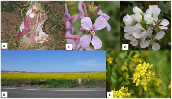 Some plants of the family Brasicaceae. (A) Turnip (Brassica rapa L. subsp. rapa) grazed by sheep as evidenced by the presence of faeces. (B) Detail of the flower of purple mistress (Moricandia arvensis). (C) Detail of the flower of white rocket (Diplotaxis erucoides). (D) A typical image of a canola/rapeseed (Brassica napus) field. (E) Detail of a cluster of flowers of canola plant (B. napus).