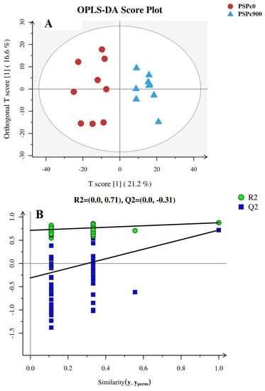 The score plots and validation plots of OPLS-DA for lipid profiles in the liver of juvenile American eels in the PSPc0 and PSPc900 groups are shown in Figure 1A,B, respectively. The higher scores and validation indexes of OPLS-DA indicate that there might be a robust model with a low risk of overfitting and reliability. The samples of the two groups were well separated, implying that the OPLS-DA model could be utilized to identify the differences between the two groups.