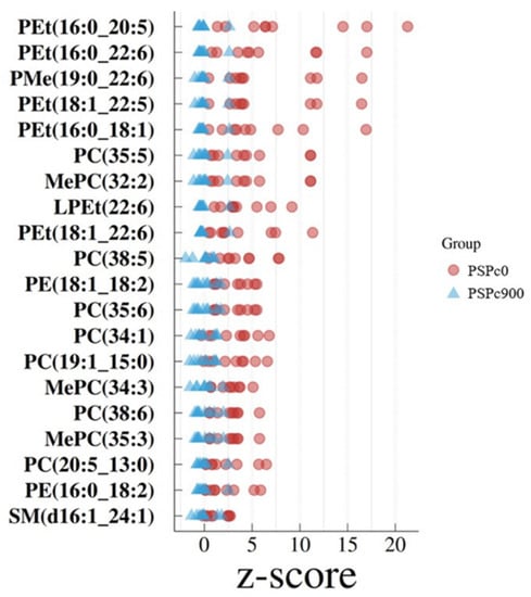 There were 204 lipids belonging to 23 subclasses in the livers of the juvenile American eels in the PSPc0 group and PSPc900 group. Ultimately, 20 kinds of lipids (VIP > 3.0, p < 0.01) were selected as significantly different lipids between the PSPc0 group and the PSPc900 group. As shown in Table 5, the 20 lipids were primarily methyl phosphatidylcholine (MePC), phosphatidylcholine (PC), sphingomyelin (SM), phosphatidylethanolamine (PE), phosphatidylethanol (PEt), lysophosphatidylethanol (LPEt), and phosphatidylmethanol (PMe). Z-score analysis was performed on 20 significantly different lipids (Figure 2). In Figure 2, the x-coordinate is the Z-score value and the y-coordinate is the different lipids. Each circle or triangle represents a sample of the PSPc0 group or PSPc900 group. The Z-score value is converted based on the relative lipid content with PSPc0 as the reference data set.