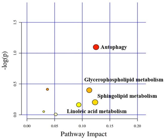 The differential metabolic pathways by the functional enrichment analysis on 204 lipid metabolites in the PSPc0 group and PSPc900 group are shown in Table 6. Autophagy, sphingolipid metabolism, glycerophospholipid metabolism, and linoleic acid metabolism were the major metabolic pathways (Figure 3). PE was upregulated in autophagy, ceramides (Cer) were downregulated in sphingolipid metabolism, PC and PE were upregulated and 2-lysophosphatidylcholine (2-LPC) was downregulated in glycerophospholipid metabolism, and PC was upregulated in linoleic acid metabolism.