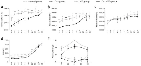 The identification results of immunosuppressed chicken model. (a–d) Comparison results of body weight and organ coefficient between ND group and Dex + ND group, respectively. * Significant difference between the two groups (p < 0.05); ** very significant difference between the two groups (p < 0.01). (e) Serum Newcastle disease virus (NDV) antibody titers in different treatment groups.