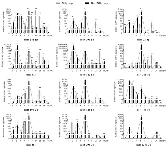 In the transitional phase from innate immunity to acquired immunity (4–5 dpi), qRT-PCR results showed that, compared with ND group, all miRNAs were significantly upregulated in the Dex + ND group at 4 dpi and 5 dpi (p < 0.05). It is worth mentioning that miR-34a-5p, miR-20a-5p, miR-22-3p, miR-30b-5p, miR-19b-3p, miR-126-5p, miR-451, miR-29b-3p, and miR-124a-3p reached their expression peaks at 5 dpi, while miR-375, miR-122-5p, and miR-199-5p also showed obvious high expression. This indicated that the expression levels of candidate circulating miRNAs increased in the transition stage from innate immunity to acquired immunity of the ND group under Dex-induced immunosuppression. In addition, compared with 4 dpi, 5 dpi was a key timepoint to better reflect these changes.