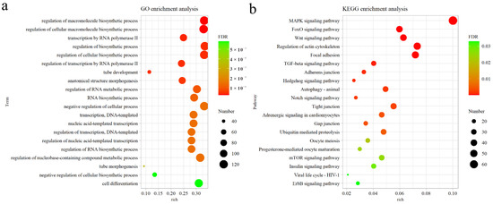 Functional enrichment analysis of genes targeted by 12 candidate miRNAs. (a) The top 20 enriched GO terms in BP (p < 0.05). (b) The top 20 enriched KEGG pathways (p < 0.05).