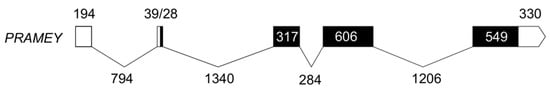 Genome structures of the ovine PRAMEY. PRAMEY contains five exons and four introns. Black boxes represent coding regions, and white boxes represent 5′ UTR and 3′ UTR regions. The UTR, introns, and exons are drawn to scale.