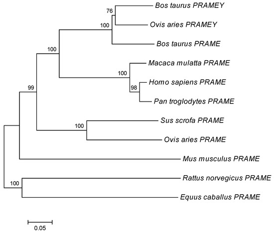 Neighbor-joining tree of PRAMEY/PRAME proteins. The GenBank accession numbers of PRAMEY protein are Bos taurus, ADP21954, and PRAME protein are Bos taurus, NP_001232882; Macaca mulatta, AFJ71405; Homo sapiens, CAG30435; Pan troglodytes, NP_001267447; Sus scrofa, XP_020953254; Ovis aries, XP_027831889; Mus musculus, NP_001108549; Rattus norvegicus, XP_001055257.2; Equus caballus, XP_023502450. The numbers on the branches represent 1000 bootstrap values.