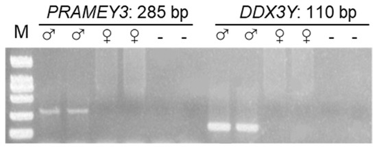 Before the qPCR analysis, a conventional PCR was run to validate the male specificity of the PRAMEY and DDX3Y primers. The results revealed that all primers used only have amplification in male genomic DNA or testis cDNA (Figure 3 and Figure 4), indicating that the designed primers were male-specific and can be used for the subsequent analysis.