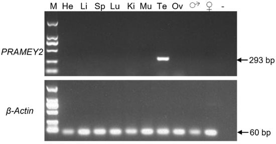 - Mistry, B.; Zhao, Y.; Chang, T.-C.; Yasue, H.; Chiba, M.; Oatley, J.; Díaz, F.; Liu, W.-S. Differential Expression of PRAMEL1, a Cancer/Testis Antigen, during Spermatogenesis in the Mouse. PLoS ONE 2013, 8, e60611. [Google Scholar] [CrossRef]