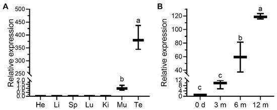 Relative expression levels of the PRAMEY mRNA in Hu sheep were detected by qPCR. (A) The expression level of PRAMEY in seven different tissues at 6 months old. PRAMEY was expressed mainly in testis and slightly in muscle. He: heart; Li: liver; Sp: spleen; Lu: lung; Ki: kidney; Mu: muscle; Te: testis. (B) mRNA expression abundance of PRAMEY at different developmental stages of testis. The expression of PRAMEY mRNA was expressed very low at 0 days and 3 months but significantly upregulated at 6 and 12 months. Values are means ± SD of three biological replicates (n = 3). Different letters above error bars indicate significant differences, p ≤ 0.05.