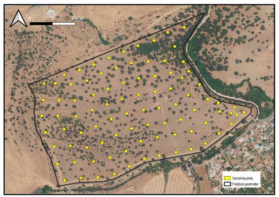 The study was carried out on a commercial dehesa farm called ‘Las Albaidas’ located in the municipality of Cordoba, Spain. The farm consisted of a single fenced paddock with an area of 23.1 hectares and an average altitude of 150 m above sea level. The coordinates of the paddock centroid were 37.91° N and 4.7° W. The climate can be defined as typical Mediterranean (Csa) according to the Köppen climate classification [37]. The tree canopy cover was 24.7%. The tree layer was mainly composed of oak trees (Quercus ilex L.), although some cork oak trees (Quercus suber L.) and olive trees (Olea Europaea L.) were also present. The shrub layer was almost inexistent, except for paddock borders, which is usual in Spanish dehesas dedicated to livestock production. The pasture layer consisted of natural vegetation, including various grass and legume species, e.g., Dactylis glomerata L., Hordeum murinum L., Lolium perenne L., Poa bulbosa L., Medicago arabica H., Ornithopus compressus L. and Trifolium subterraneum L. There was a single water trough at the southeastern end of the paddock.