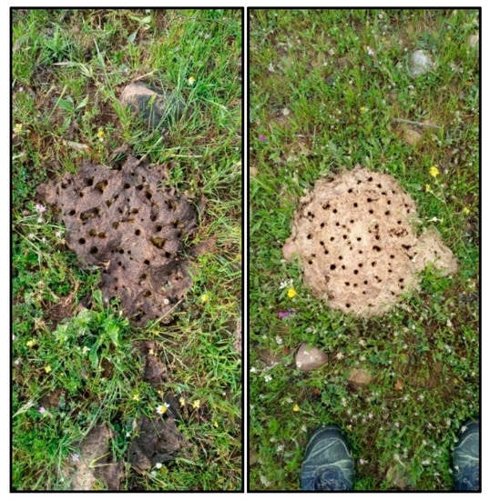 The sampling plots were examined weekly from 15 February 2021 (winter) to 2 July 2021 (summer). The number of new feces per week inside each plot was registered in an MS Excel file. Once registered, the feces were marked with a pike to avoid double counting in the following weeks (Figure 2).