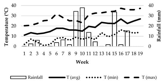 For the characterization of weather conditions during the study, we used the records of an agroclimatic station located at the ‘Rabanales Campus’ [43], which is only 2.1 km from the ‘Las Albaidas’ farm. The following variables were registered daily: average, maximum and minimum temperature (°C), rainfall (mm), average relative humidity (%), total solar radiation (W/m2) and average wind speed (m/s). As feces counting was carried out once a week, weather records were aggregated on a weekly basis. Of course, microclimatic differences may have existed within the paddock, which implies the existence of spatial variability for weather data, but these small variations could not be recorded with the available sensors. The main values for temperature and rainfall during the experimental period are shown in Figure 3.